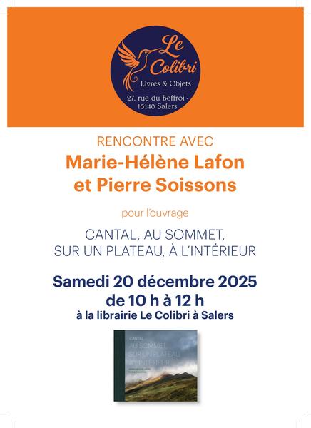 Le Colibri accueille Marie-Hélène Lafon & Pierre Soissons pour une rencontre littéraire autour de l'ouvrage "Cantal, au sommet, sur un plateau, à l'intérieur"…