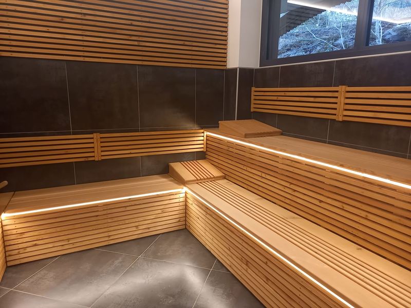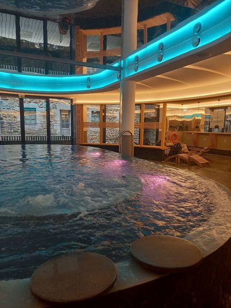 Chauffé à 31°, il est équipé de jets sous-marins (banc de massage), jet massant “col de cygne”, musique subaquatique, chromothérapie.