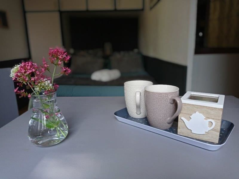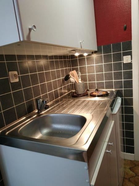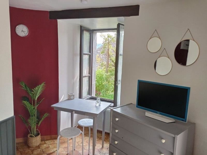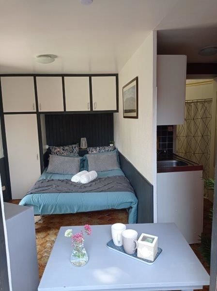 Le studio, petit mais chaleureux, comprend un lit double, une kitchenette avec table et tabourets et une petite salle d'eau avec douche, lavabo et wc.