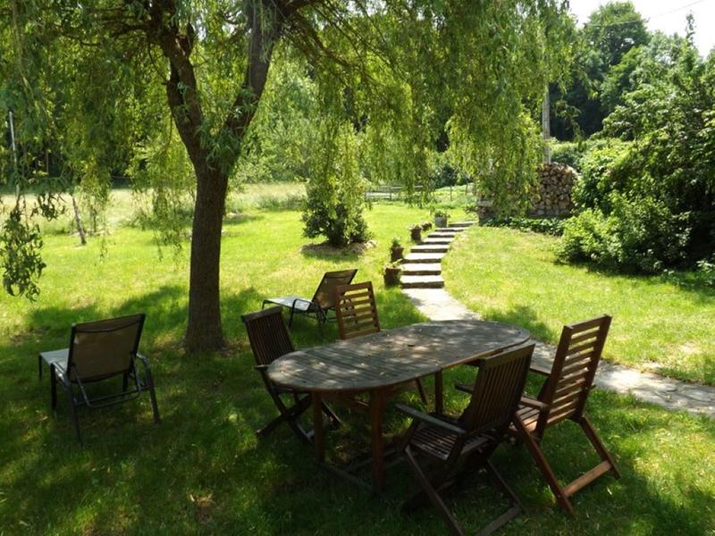 A disposition, jardin non clos privatif sur le devant du gîte avec salon de jardin et chaises longues à la belle saison.