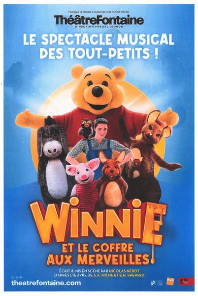 Christophe Robin a grandi et rangé ses peluches au grenier, dans un coffre. Sa fille Violette découvre le coffre aux merveilles et va suivre Winnie et ses amis dans leur univers enchanté à la recherche de l’enfance perdue de son papa. Des marionnettes grandeur nature, des chansons, des chorégraphies et des décors féeriques vous feront vivre une expérience hors du commun en compagnie des personnages qui ont bercé tant et tant de générations. Une Comédie Musicale pour toute la famille, à partir de 3 ans. Écrit et mis en scène par Nicolas Nebot (Jules Verne, Les Mystérieuses Cités d’or, Smile…) d’après l’œuvre de A.A. Milne et E.H. Shepard. Musiques Dominique Mattei. Chorégraphies Patricia Delon. Marionnettes Mehdi Garrigues. Costumes Marie Crédou. Lumières Laurent Béal.